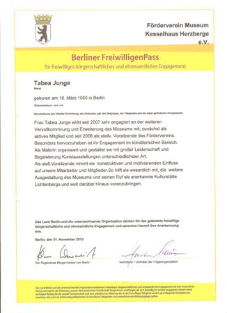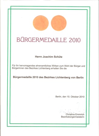 >> 2010 wird dem Vereinsvorsitzenden Joachim Schütz die Bürgermedaille verliehen.¹ Tabea Junge als stellv. Vorsitzende erhält den Berliner Freiwilligenpass.²