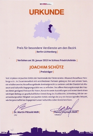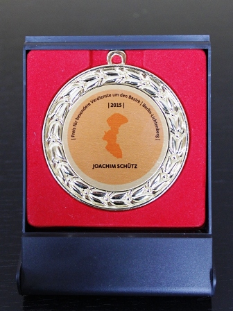 >> 2015 wird Joachim Schütz mit dem "Preis für besondere Verdienste um den Bezirk" ausgezeichnet.³ An die Vorstandsmitglieder Ina-Maria Bormeister und Ingrid Schelske wird der Berliner Freiwilligenpass verliehen.⁴